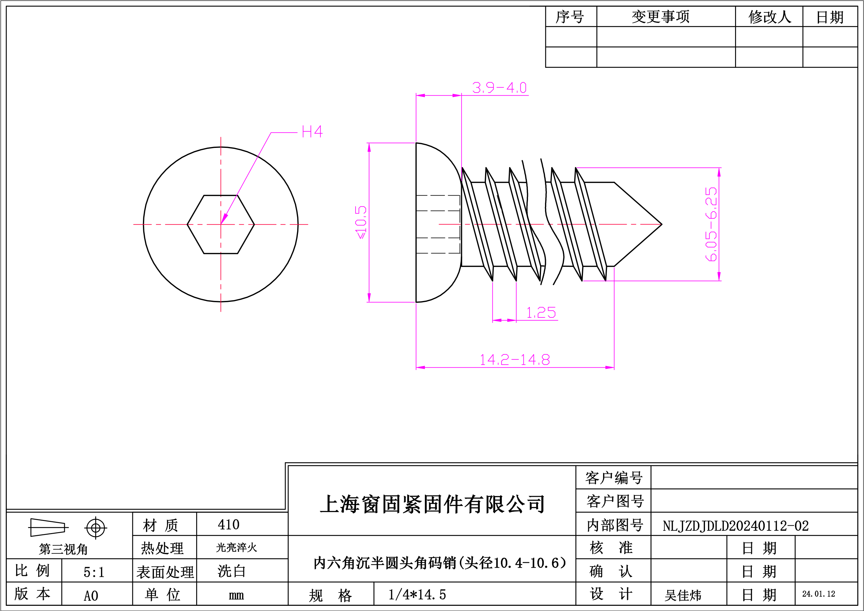 不锈钢410内六角沉半圆头角码尖尾销~1/4*14.5~洗白~(头径≤10.5)