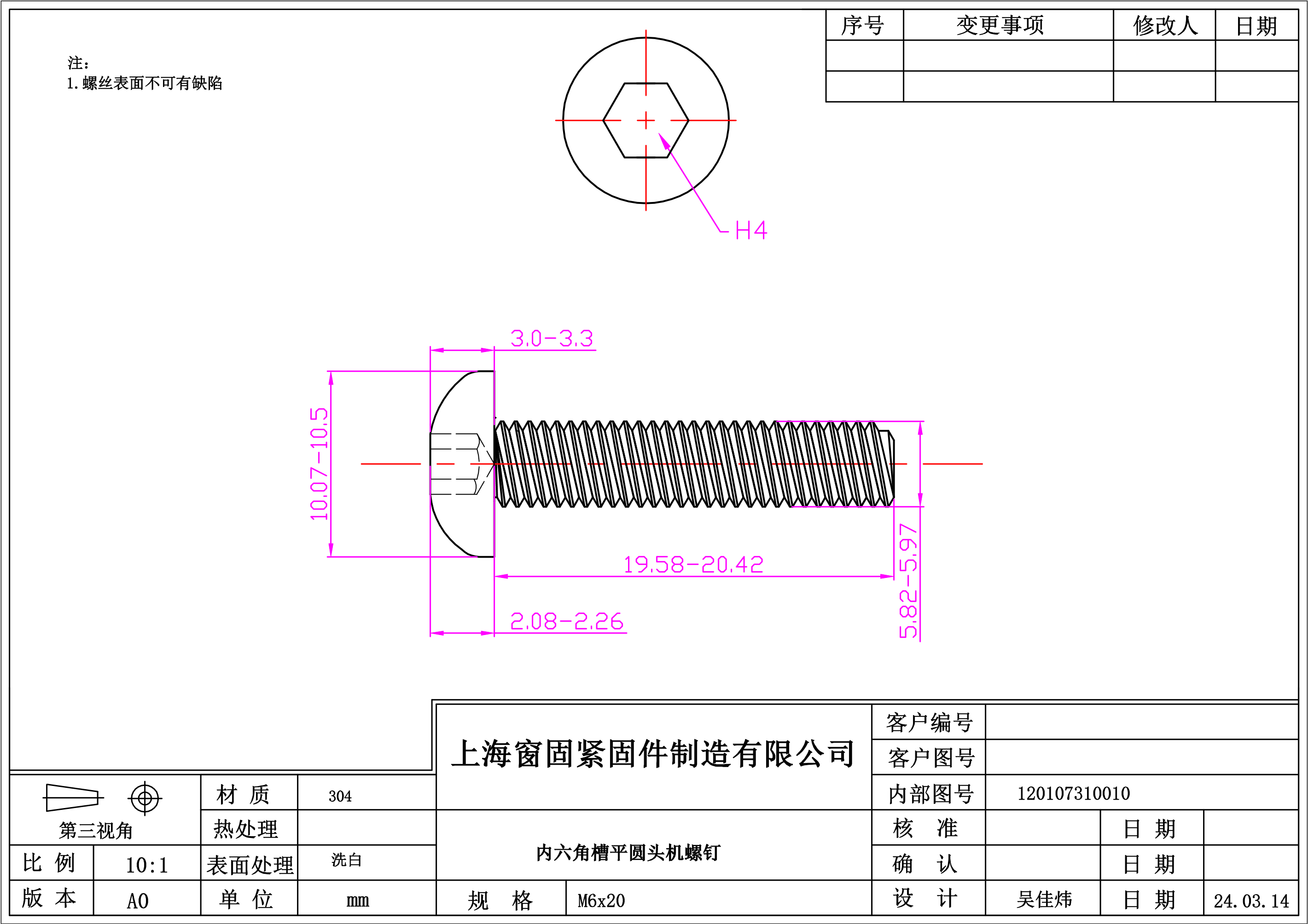 不锈钢304内六角平圆头机螺钉~6*20~洗白